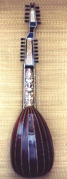 76cm & 105cm, 13 courses; after J.H. Goldt 1734 (V&A Museum No. 4274/1856) 9 ribs; the original is in rosewood with ivory strips between. Neck and fingerboard are inlaid with elaborate marquetry panels of ivory and tortoiseshell and then engraved. The double pegbox has two pierced ivory foliage panels inlaid and is edged with ivory. Because of their size, both this and the Edlinger (No.32) may have been for Baron's D minor theorbo tuning in which the top string in f' was simply omitted and an extra note added in the bass. However in actual use it seems to work perfectly for playing Bach and Weiss at A=415Hz. At 415Hz the top string in gut would be 0.40 which is a perfectly normal size. Even the most difficult chord shapes in Bach seem in practice to be entirely feasible, so probably we have been rather too scared of these authentically large sizes in the recent past.