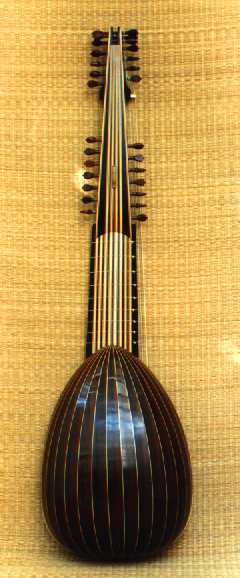 64cm & 93cm, 14 courses (7 x 2 + 7 x 2) after Matteo Sellas 1637 (Gemeentemuseum) 17 ribs, the original is similar in decorative detail to the Paris instrument but without the engraved fingerboard panels. The larger size gives a more satisfactory sound, although both sizes appear to have been common. For tuning in G.